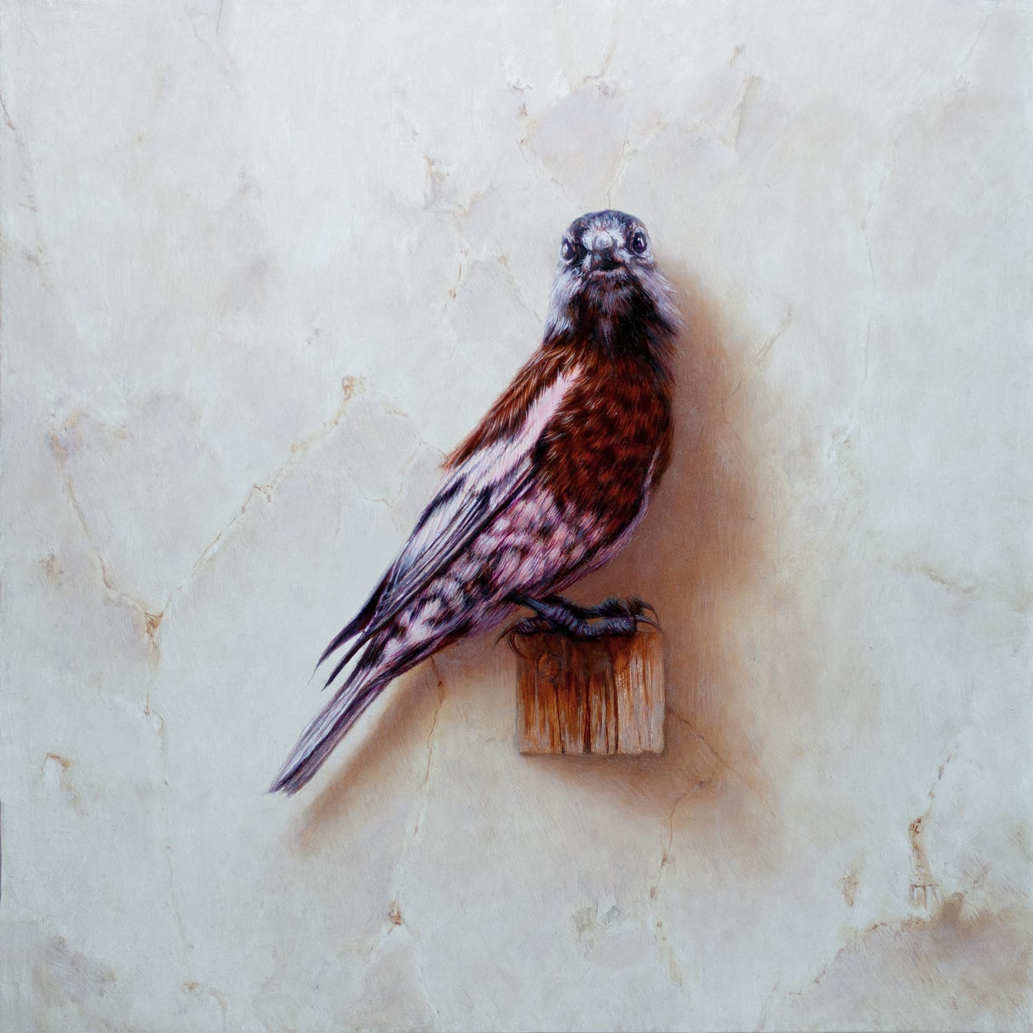 They are gorgeous. The rich color of her plumage is stunning. I love the finished finch and am so intrigued by the Gray-crowned Rosy Finch you’ve started. The background is fascinating and different.